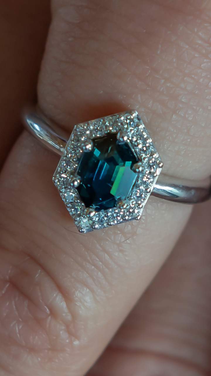 Teal Sapphire & Diamond Hex Halo Ring in 9ct White Gold