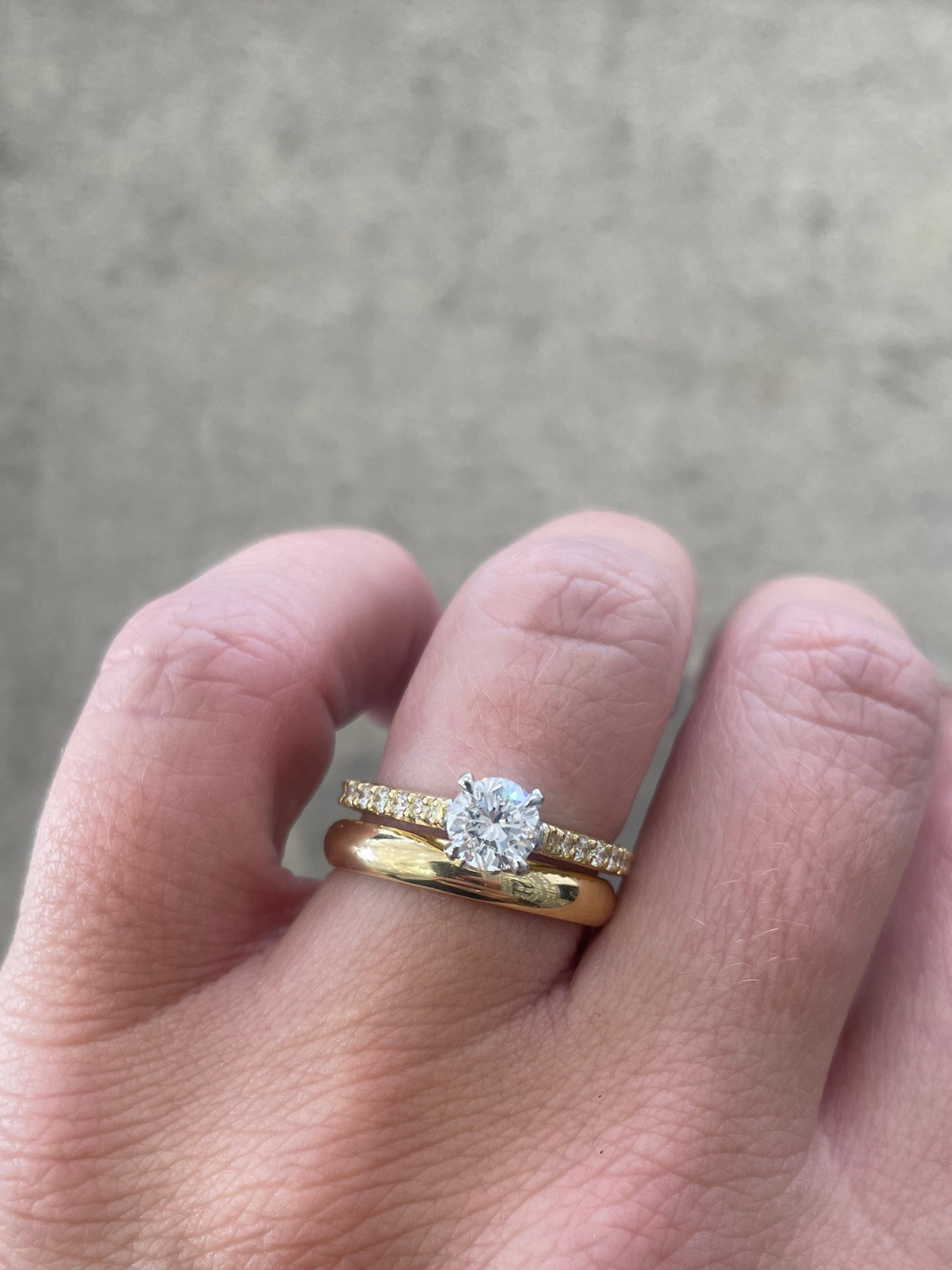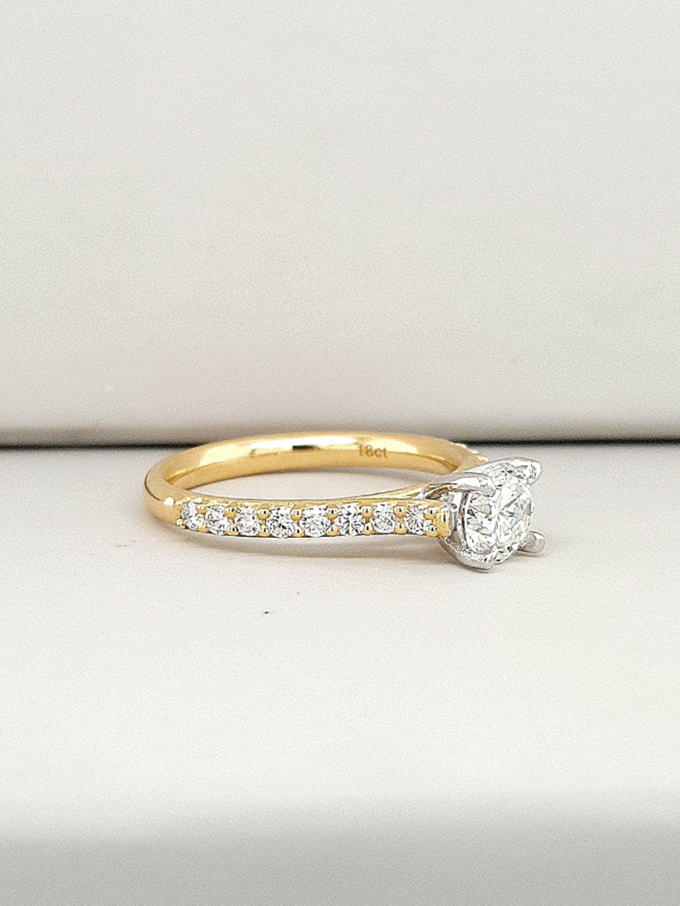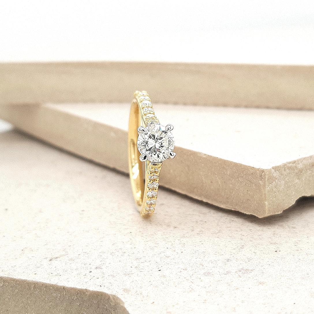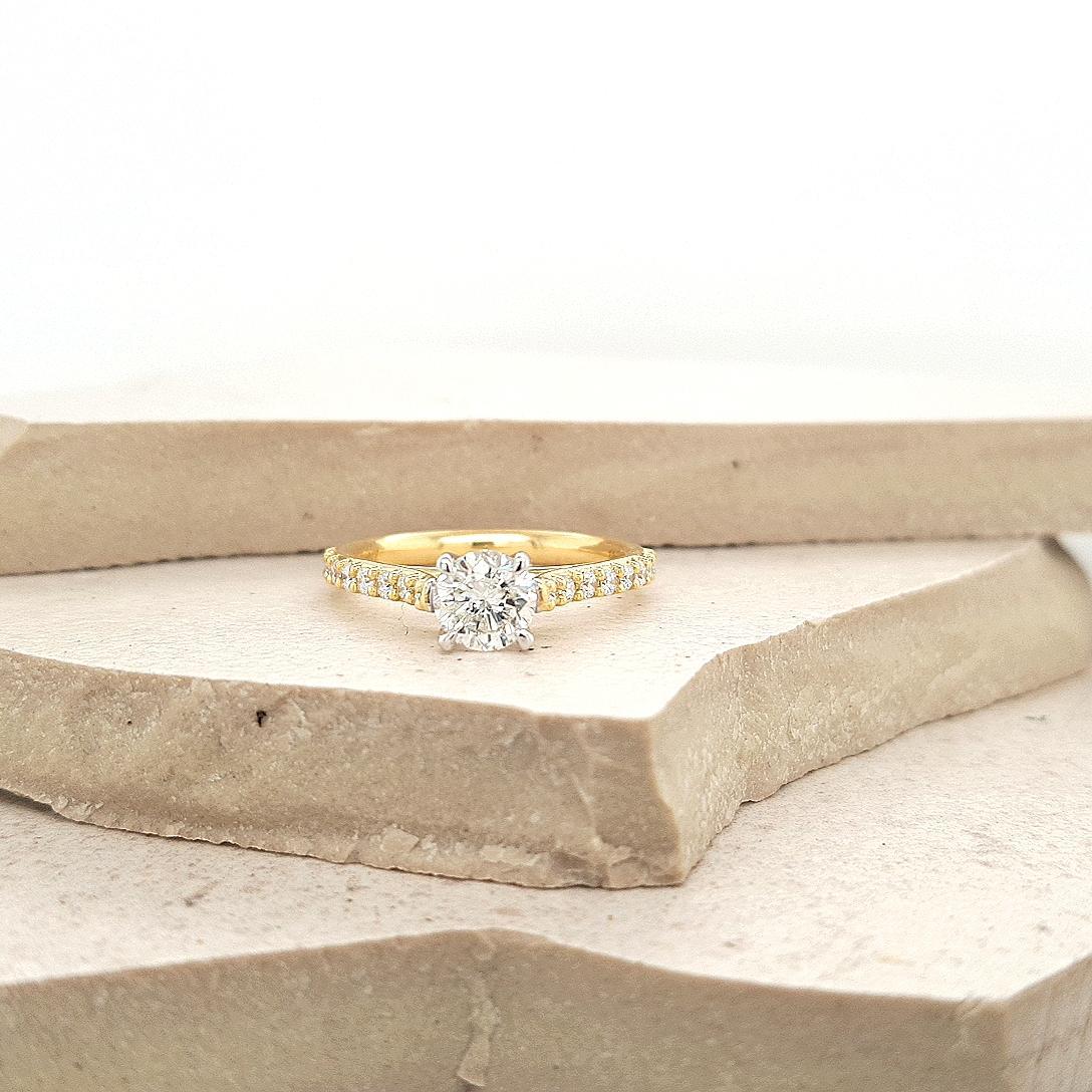 18ct Yellow and White Gold 0.74ct Round Brilliant Diamond with 0.32ct Accent Shoulder Diamond Ring